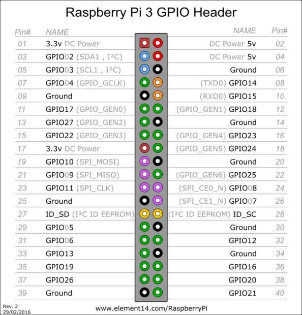 El Raspberry Pi 3 cuenta con el mismo encabezado de 40 pines entrada-salida uso general (GPIO) como todo el Pis que se remonta a la modelo B + y a + modelo. Cualquier hardware existente de GPIO funcionará sin modificación; el único cambio es un interruptor que UART se expone en las patillas de GPIO, pero que es manejado internamente por el sistema operativo.