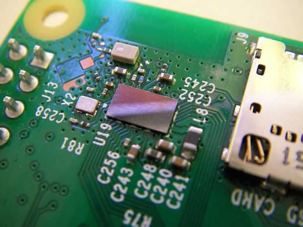 Tan pequeño, sus marcas sólo pueden verse correctamente a través de un microscopio o lupa, el chip de Broadcom BCM43438 proporciona soporte de radio inalámbrico LAN, Bluetooth y Bluetooth clásico. Hábilmente construido directamente en el tablero para mantener los costos bajos, en lugar de lo más común del módulo completo, su función sólo es un radiorreceptor de FM desconectado.