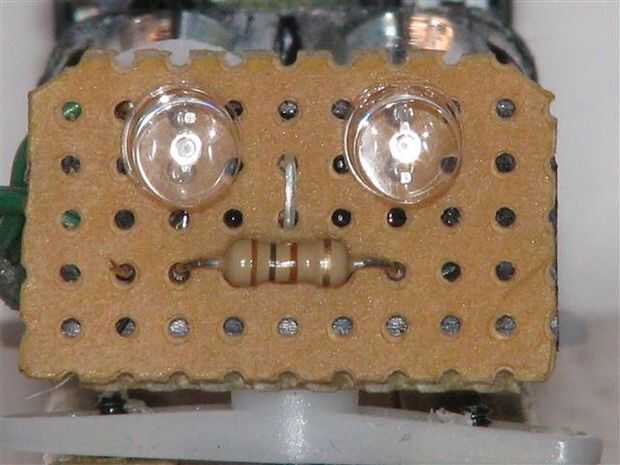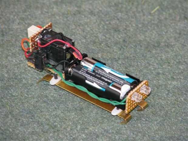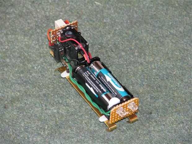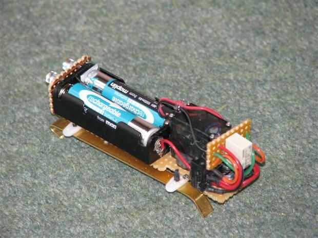 El 'cerebro' de este robot es un relé de enganche, los sensores son un par de microinterruptores y el 'músculo' es un motor de servo modificado. Energía viene de 2 baterías de x AAA. Un par de LEDs iluminar un poco las cosas.