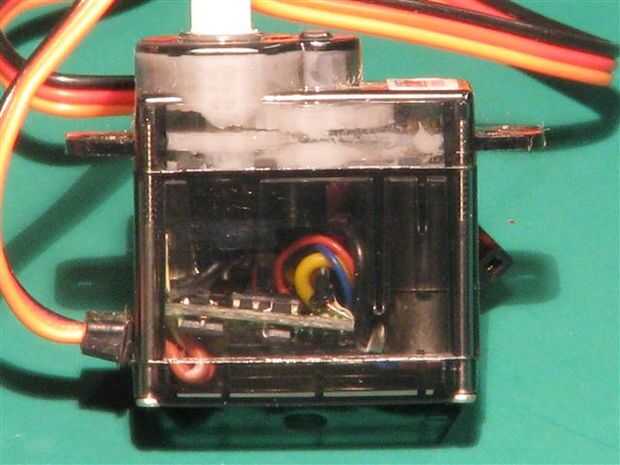 Hice este hace tiempo sin sacar fotos así que sólo te daré este enlace a Instructable de Guibot. Servos varían, pero el principio es el mismo:-parada potenciómetro limitando movimiento: cortar la pestaña de tope en el engranaje: Conecte los conductores del motor para suministrar cables.