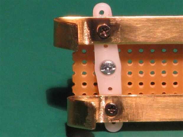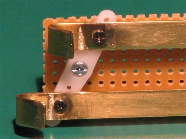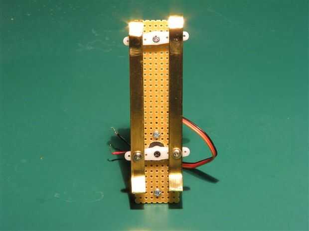 Montar el servo y el delantero par de cuernos en antes de perforar el metal y perfore y montar uno por uno para conseguir los agujeros en los lugares correctos. Utilice los tornillos pequeños que vienen con el servo para fijar las tiras delanteras y más uno mismo-extractores en la parte trasera como éstos también actúan como un tope mecánico por golpear la placa perforada. Ponga un trozo de 3mm termo retráctil sobre los tornillos largos.