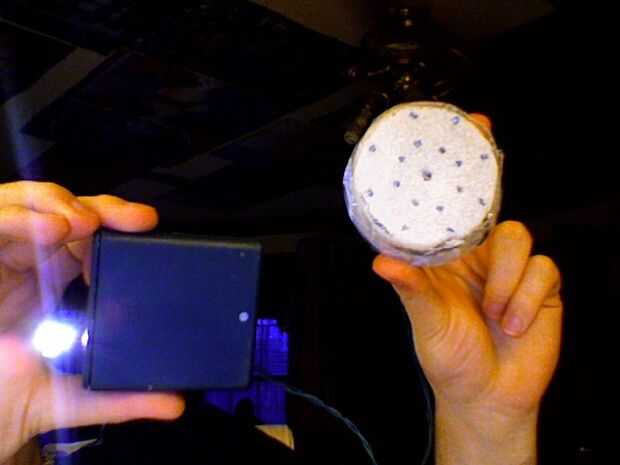 2. una hockey puck pieza en forma de espuma de poliestireno blanco (1-pulgada de espesor, justo por debajo de 3 pulgadas de diámetro). Tengo mi pieza cortando la parte inferior de una pieza cónica de arte icopor ya tenía. Embalaje de espuma de poliestireno será probablemente demasiado frágil para cortar y también tiene menos opacidad/reflectividad. Quisiera recomienda utilizar el encendedor, artesanía de espuma de poliestireno que tiene la mirada cristalizada y se hace para cortar (Michaels es una buena opción).