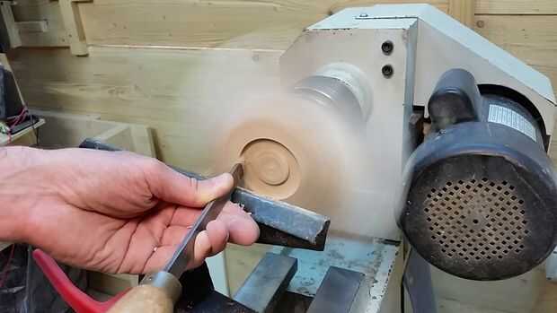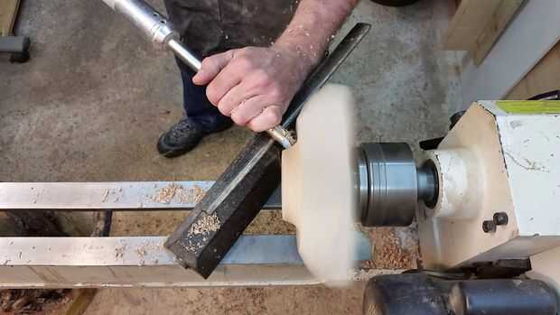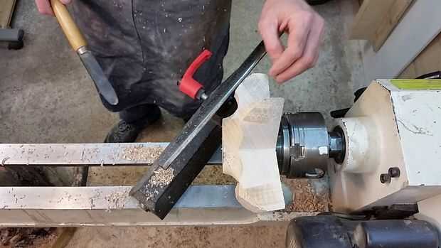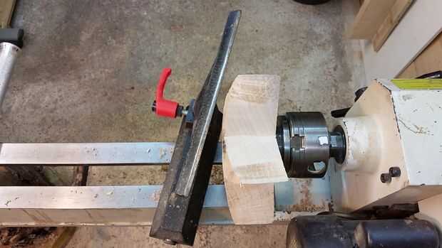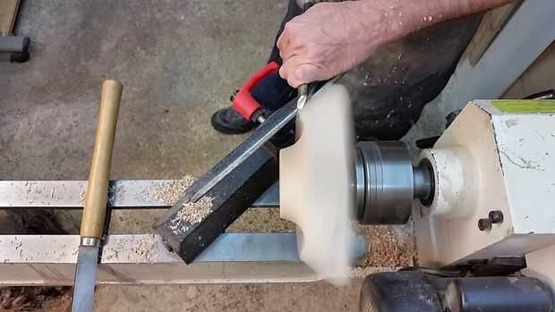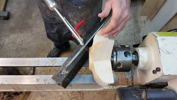 Ahora la estrella es segura (relativamente) montado en su torno, se forma el fondo de la olla. Mis herramientas de elección aquí están un escoplo, un raspador de redondos de la nariz (que no tengo una foto, pero aparecerá en el video) y una gubia de tazón de fuente. Usaremos la herramienta de partida para crear una escopladura para poder montar el recipiente a la inversa una vez que terminamos la parte inferior por lo que podríamos trabajar en la parte superior.