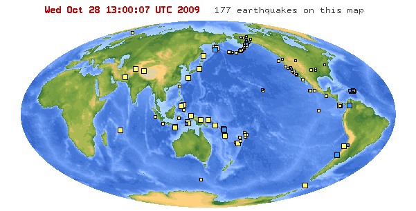 Al día siguiente en el trabajo me era curioso y quería aprender más acerca de este evento, así que busqué la Página Web USGS y comenzó la lectura. Mientras miraba alrededor del sitio, encontré una Página con una imagen del mundo y un gran cuadrado amarillo sobre las Islas Samoa. Como vieron esta tabla y brevemente, actualiza la página, otra gran plaza, esta vez rojo, apareció sobre la costa de Indonesia. El mouse-over Lee que era un terremoto de magnitud 7.6. Había ocurridos minutos, si no segundos antes de que vi que cuadrado rojo aparece.