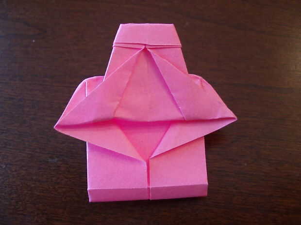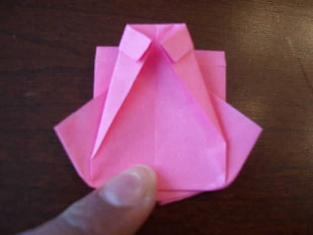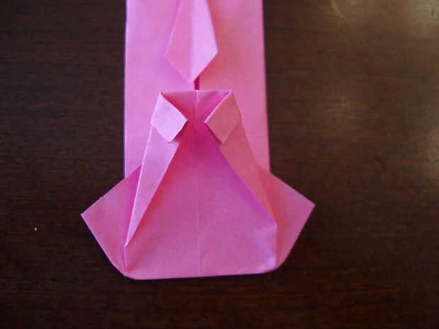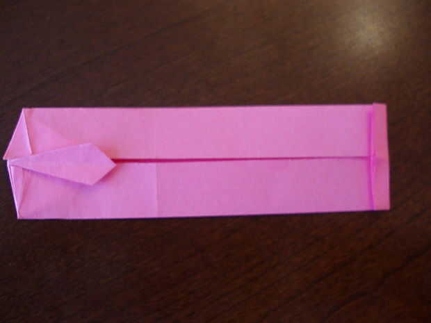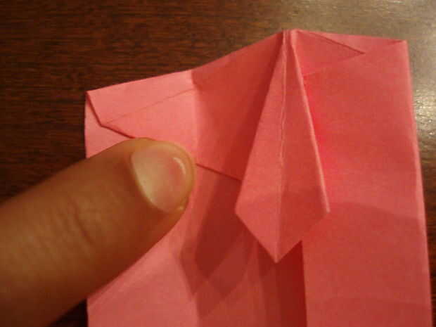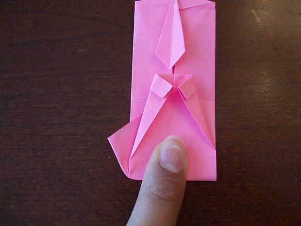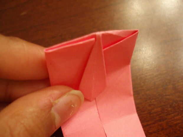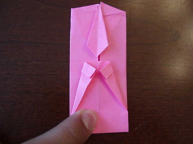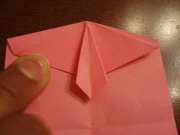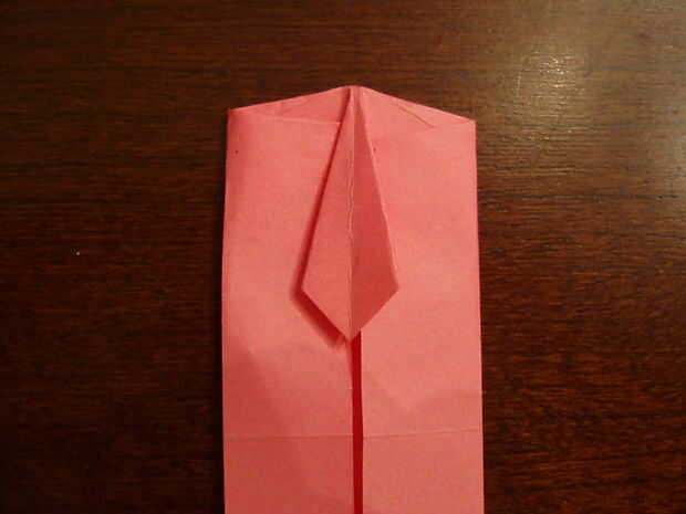 6. Doblar el triángulo hacia abajo. Doble el lazo por la mitad, a un lado del lazo al otro. Aplanar la parte superior cuando lo sigue.