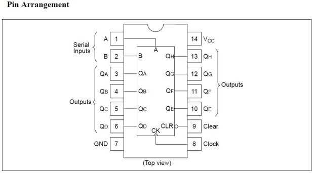 El 74HC164 es un chip de 14 pines, tiene 4 pines de entrada, salida de 8 pernos, energía y tierra, que permite iniciar desde la parte superior.