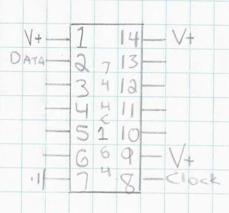 Los pines 1 y 2 son las entradas de la serie, son configurados como lógica y puerta, lo que significa que ambos tienen que ser lógica alta (es decir 5 voltios) en orden para la broca a ser visto como un 1, un estado bajo (0 voltios) ya sea leerá como un cero. Realmente no necesita esto y fácil de tratar en software, así que elegir una y atarla a V +, por lo que lee siempre alto. Decido utilizar un puente del pin 1 al pin 14 (V +), puesto que usted puede simplemente pop un jumper de la placa sobre el chip. El uno restante entrada serial (perno 2 en mi esquema) será goto pin digital 2 de arduino.