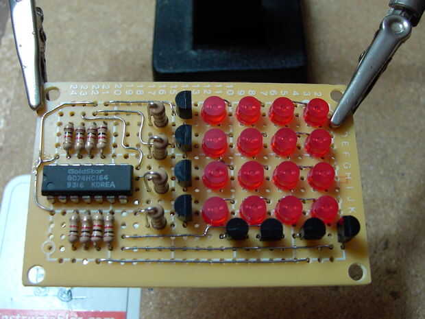 Hay 4 filas y 4 columnas, cada fila es un resistor y un transistor, en cada columna que los cátodos de los LED están atados juntos, funcionó en el colector de un transistor, cuya base también es controlado por el registro de desplazamiento y finalmente para tierra.