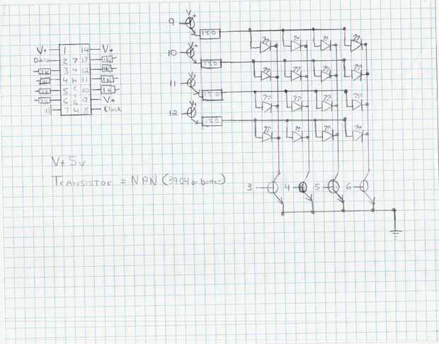 Los circuitos también se diferencia en que el registro de desplazamiento no es conducir directamente el led, en cambio las salidas del registro de desplazamiento se envían a través de un resistor de 1Kohm a la base de un transistor NpN, cuando la salida de la broca es alta, permite bastante corriente y voltaje en el transistor para cambiar la interpolación de conexión el colector y el emisor, los colectores están vinculados a un "robusto" 5 voltios regulados.