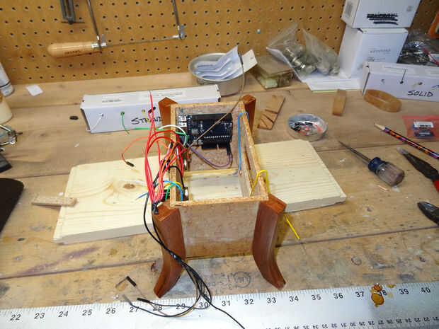 Usé un picahielos ' pretaladrar ' algunos pequeños agujeros en la caja y luego atornillar el Arduino y los tableros del reloj RTC en lugar. Había conectado a Arduino y luego agregué el sensor de la tapa y había cableado última. Lo hice así porque me daba pereza y no tenía ganas de hacer más pequeños agujeros para el sensor de la tapa ser atornillado a las paredes internas de la caja del reloj. Simplemente se sienta en la cima de todos los cables.