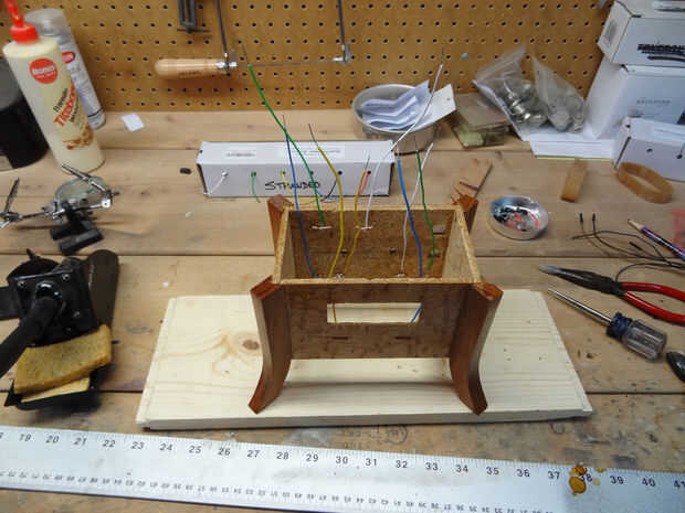 Medido y luego vuelva a medida donde debe ir el alambre de cobre para los sensores de capacitancia, luego perforados pequeños agujeros para aceptar el alambre. El alambre de cobre es de Home Depot, pero era algo que tenía por ahí en otro trabajo eléctrico. Es calibre 14. Me había doblado a forma entonces había empujado a través de los agujeros y doblar los lados traseros. Entonces había soldado algunos colores alambre trenzado a ella para conectar a la Junta de arranque de cap1188.