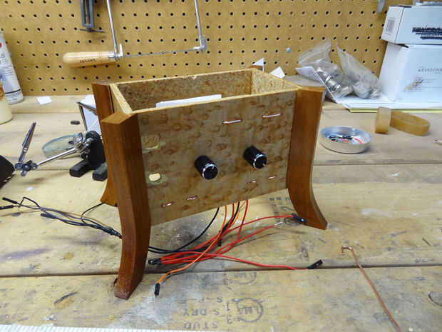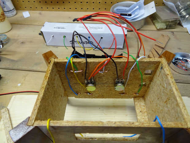 Yo también perforado dos agujeros para los 10k de potenciómetros y soldar los cables a ellos. Por último, perforé un agujero para el interruptor de encendido/apagado. En este momento el reloj era solo un lío de cables asomando la parte superior de la caja con no electrónica dentro.