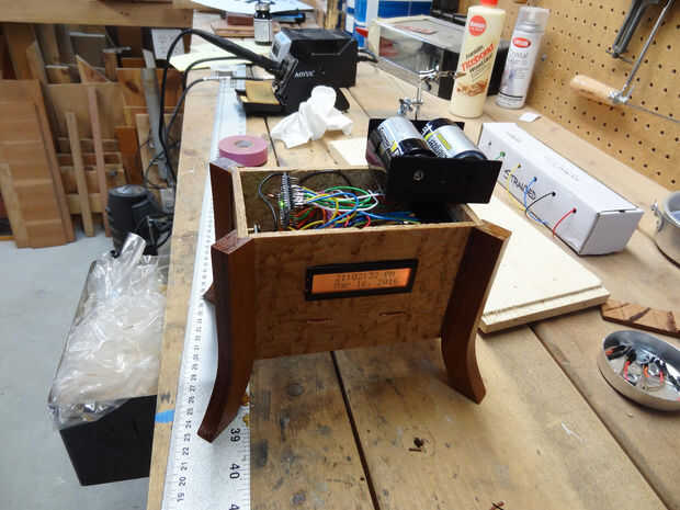 Por último soldar la batería de refuerzo para el paquete de baterías D-cell 2, cable para arriba y empujó en la parte inferior del reloj. Se llevó a cabo en lugar por la fricción y un pequeño trozo de madera que pegué en la parte inferior. Debo haber pensado que parte a través de más, pero oh bien, funciona bien y nadie puede ver a menos que se ven activamente.