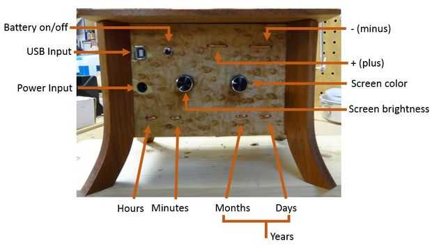 La batería de encendido/apagado es útil para el ahorro de baterías y para reajustar el reloj. Este debe ser apagado cuando el reloj recibe energía desde una verruga de la pared o desde USB. Dos potenciómetros de 10k-ohm controlan el brillo de la LCD y el color.