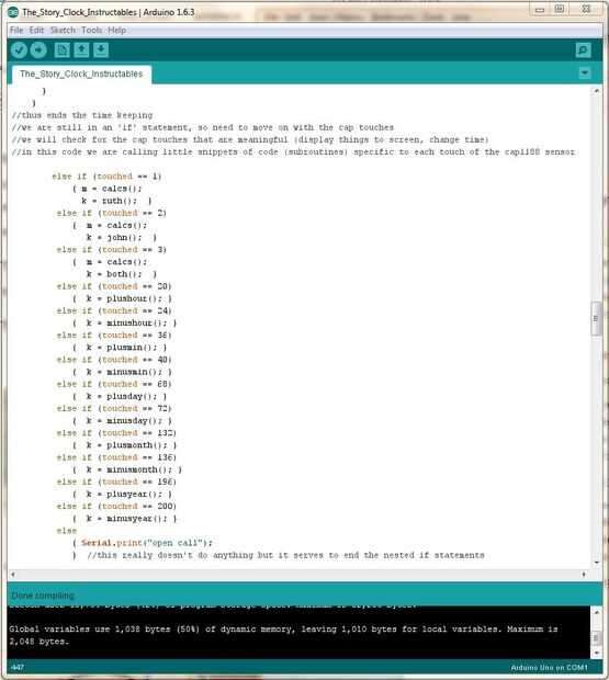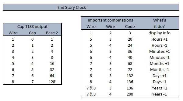 Así, con 8 cables conectados al sensor de capacitancia, podemos tener muchas diferentes combinaciones [(2^8)-1 = 255 combinaciones] a hacer cosas diferentes. Codifiqué sólo el reloj de 13 diferentes cosas. Son: algo de persona 1, algo sobre la persona 2, algo de ellos juntos, más horas, menos horas, más minutos, menos minutos, más días, menos días, más meses, menos meses, más años y menos años.