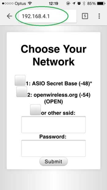 A continuación, abra su navegador de internet (Safari, Chrome, Firefox) y escriba "192.168.4.1" en la barra de direcciones (donde normalmente escribiría