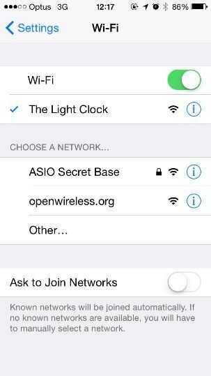Primero conectarse a la red de wifi "El reloj de luz". Porque esta red no está conectada a los teléfonos de internet a veces puede tardar un poco para ello. Sólo quedarte con él, se conectará.