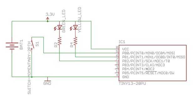 El ATtiny chip (la viruta del IC 8-pin negro) es el corazón del reloj. Este chip es básicamente una versión pequeña del mismo chip que está dentro de un Arduino, y por lo tanto puede ser programado para realizar diferentes funciones. En este caso, el chip tiene un programa que espera una prensa del botón, y cuando detecta uno, motivos varios de sus pernos para que esa corriente puede fluir de + 3 volts a través de los LEDs, iluminación para arriba. Lo ATtiny tiene un reloj interno, por lo que los LEDs están programados en flash para mostrar la hora.