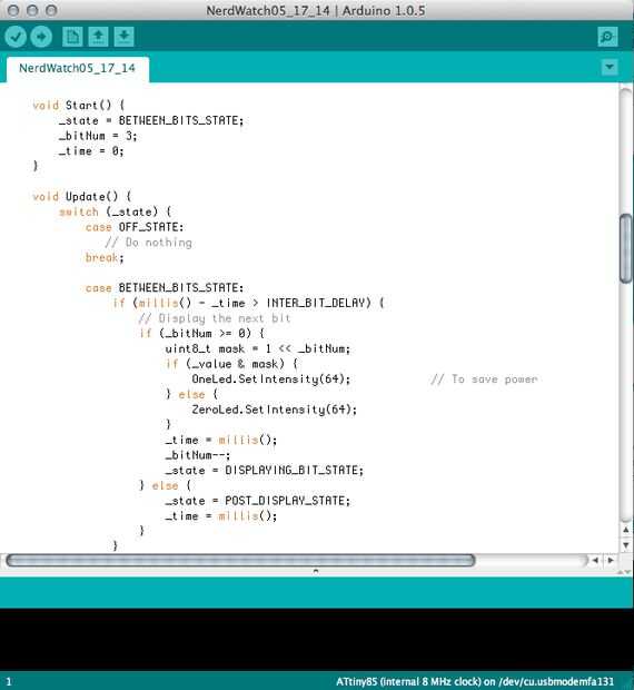 - Sketch de Arduino NerdWatch.ino a ir sobre el ATTiny. El archivo .zip incluye aquí tiene el dibujo, así como las bibliotecas que tendrá que instalar para conseguir el bosquejo funciona correctamente.