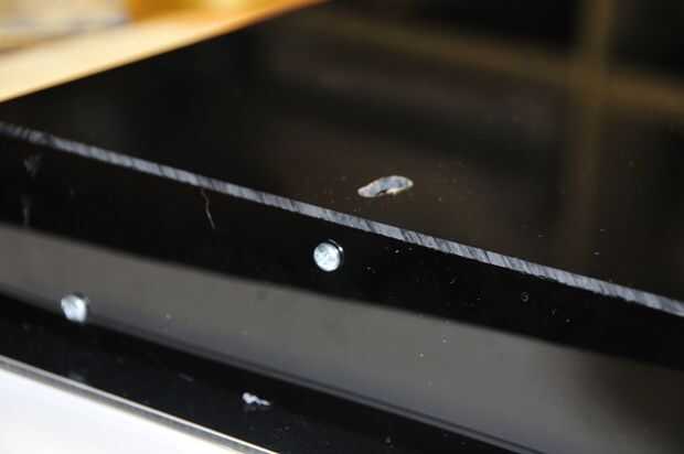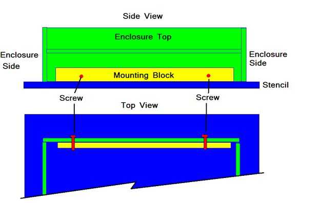 Entonces necesitamos adjuntar la plantilla de manera que podemos quitarla si es necesario y para instalar un difusor en la parte posterior de la plantilla (originalmente usé papel de seda - ahora utilizo una hoja de horno papel de hornear). He utilizado pequeños bloques de metacrilato pegados a la plantilla y unido con tornillos pequeños por el lado de la caja. Comience usando cinta adhesiva para asegurar que el borde de la caja no se pega a la plantilla. Atornillar los cuatro bloques en las esquinas del recinto, aplicar pegamento y pegar el recinto a la plantilla - Asegúrese de que el recinto esté alineado para está centralizado en la plantilla. Las adjuntas fotos le ayudará a dar sentido a esto.