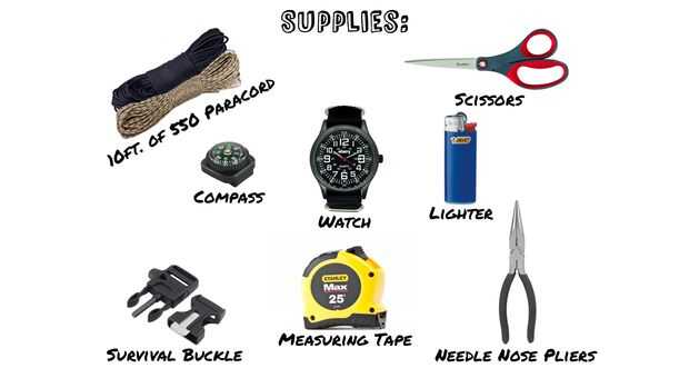 2. 10 pies de Paracord 550 (Yo usé Desert Camo y negro) $3,75