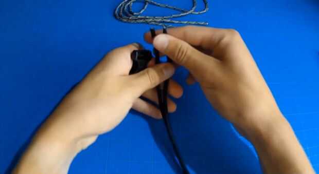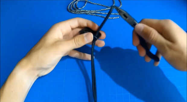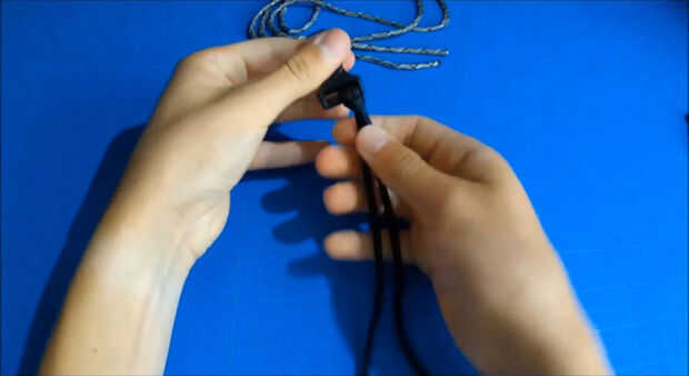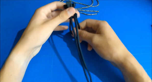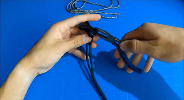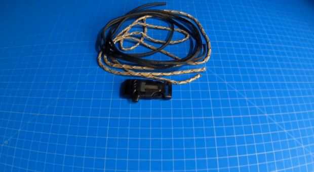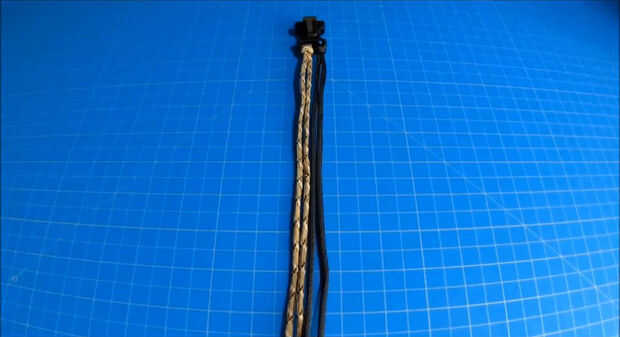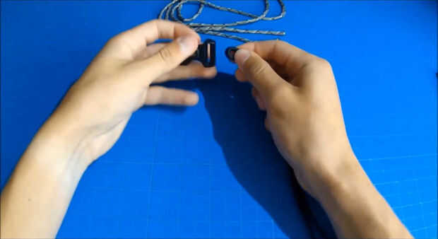 Tomar los 10 pies de paracord 550 y cortar directamente en la mitad, haciendo dos longitudes de 5 pies de paracord. Usted puede utilizar uno o dos colores, elegí negro y camo desierto. Tome una de las longitudes de 5 pies de paracord y pellizcar en la mitad. En el punto medio, coloque el paracord para el extremo hembra de la hebilla con un nudo de vaca-enganche. Alicates de punta sirven tirar el paracord a través de la ranura en la hebilla. Repita este proceso para la otra longitud de 5 pies de paracord.