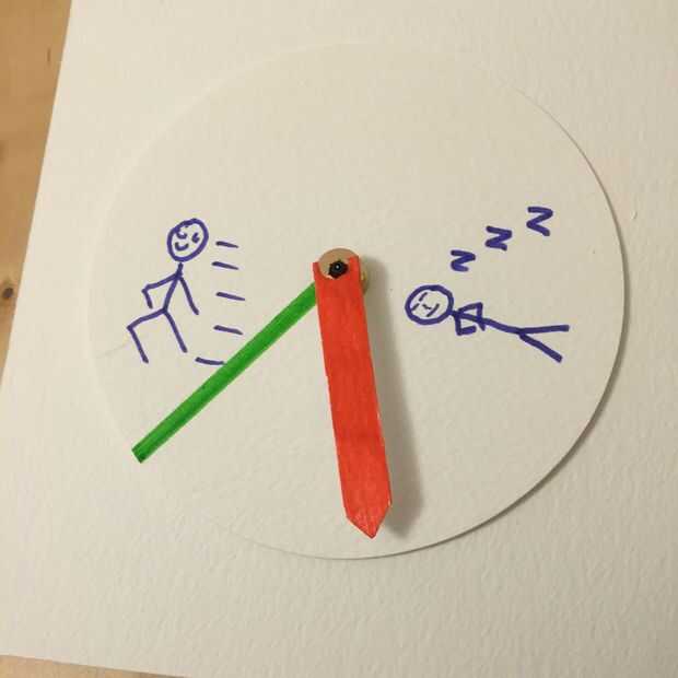 Entonces explicas que tienen que permanecer en cama, o jugar por sí mismos, hasta el la manecilla roja ha cubierto la línea verde. Puede tomar algunos intentos para que este bien, pero puede volver y mostrar que no es todavía tiempo.