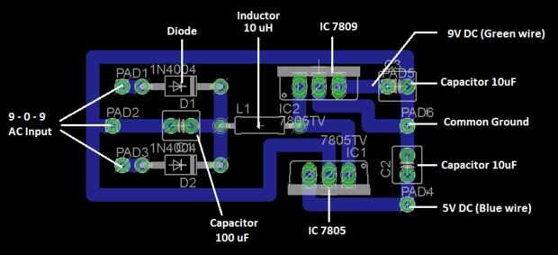 El circuito es un rectificador seguido por un filtro L-C que se convierte en la entrada para el 7809 de IC y la IC 7805. Aunque estos IC puede tolerar el calor que se genera, es mejor utilizar un disipador de calor para el 7805. Colocar el disipador de calor es cosas básicas que creo que tengo que elaborar o instruir.