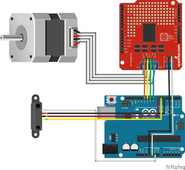 El motor paso a paso está conectado al controlador de motor a través de un paquete especial de cables, y Arduino conecta con el conductor del motor. Digitales pins 8-11 se utilizan para realizar esta conexión, y estos se utilizarán para conducir el motor hacia adelante o hacia atrás un paso. Pin 8 está conectado al paso, Pin 9 al paso B y así sucesivamente. El conductor del motor también se conecta a 5V de la energía y el segundo conector de tierra en el Arduino.