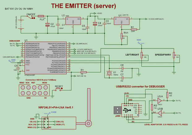 -un depurador externo (mirar las fotos) porque cuando se utiliza un USBasp (convertidor de USB a SPI) el depurador no funciona (escucha sólo el puerto COM). Usé un convertidor Usb a serial como el circuito de µMB5, un convertidor de nivel (RS232 3.3V-> 5V TTL) vinculados a RX (D0) y pines de TX (D1) (véase la shematic). Entonces usted puede lanzar al depurador después de seleccionar el puerto COM buena para escuchar. Ahora puede controlar y ver lo que envías.