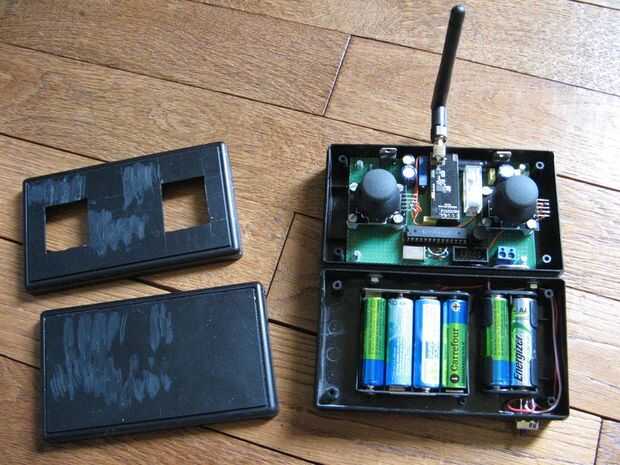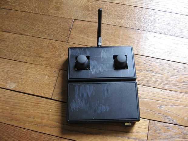 He utilizado un clon atmega328p de enlace de Arduino a un NRF24L01 + PA + LNA para tener una larga distancia para comunicarse (1000 m máximo en zonas amplias y claras) y 2 joysticks. Dispositivos muy, muy baratos.