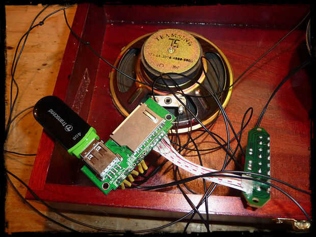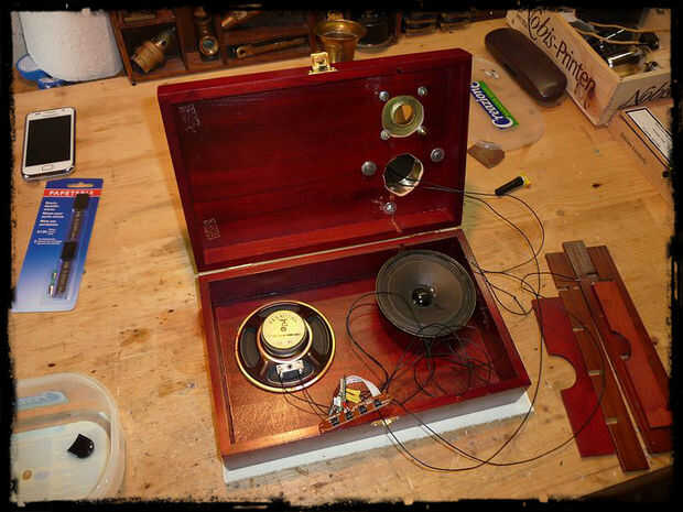 El Audiophone es alimentado por un cable USB y enchufe, así que estoy totalmente libre que fuente de energía utiliza, ya que soporta USB 5V. Puede ser un tanque de alimentación para teléfonos celulares o incluso un pequeño cargador solar con una toma USB. Incluso he construido dos paneles solares para alimentar esta pequeña máquina. Para asegurarse tener suficiente batería el pequeño voltímetro, el metro de radio, es un detalle grande y funcional.