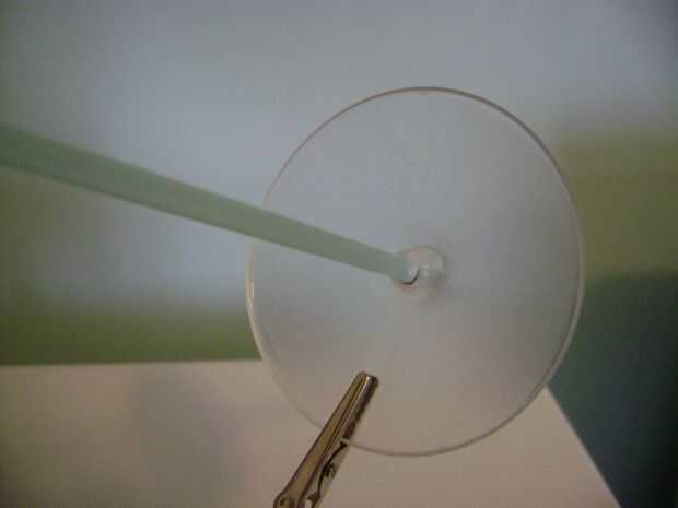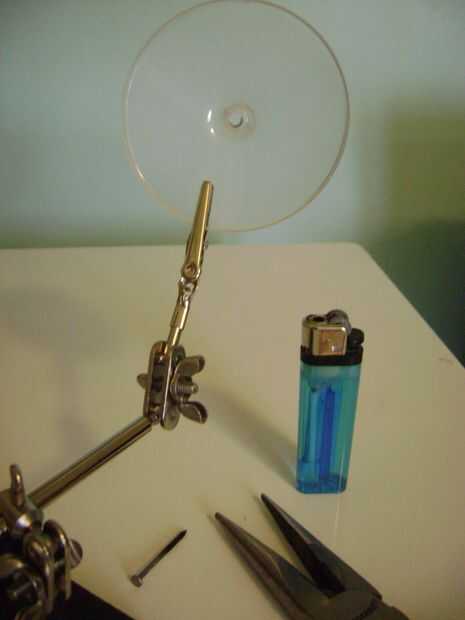 Primero perfore un agujero el centro del disco. Usando un mechero, calienta un clavo y lo empujó a través con los alicates. También puede usar un taladro.