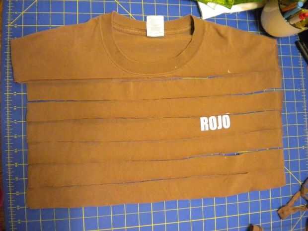 Ahora continuar cortando tiras aunque la parte delantera y trasera de su camisa hasta el cuello.  Observe cómo el logo está contenido casi en su totalidad en una tira.  (Si no ruede para arriba, puede ser agregado a la papelera de bits pequeño.)