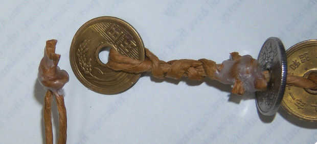 El paso final es completar el sujetador y terminar el collar. Una vez que el collar de la longitud deseada, haga otro nudo para mantener sus monedas firmemente en su lugar. Luego darse aproximadamente una pulgada y media de espacio y el hilo otra moneda en su posición. Finalmente, envuelva los dos extremos sueltos de hilo hacia el nudo anterior, manteniendo así la moneda final en su lugar. Entonces un nudo segundo justo al lado de la primera, y ya está. Cortar el los cabos sueltos y sellado con cera.