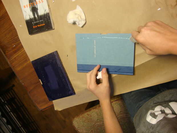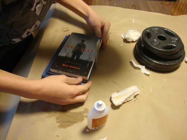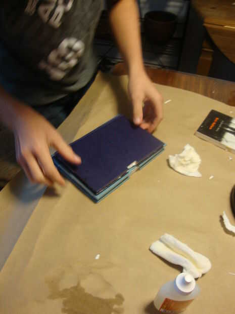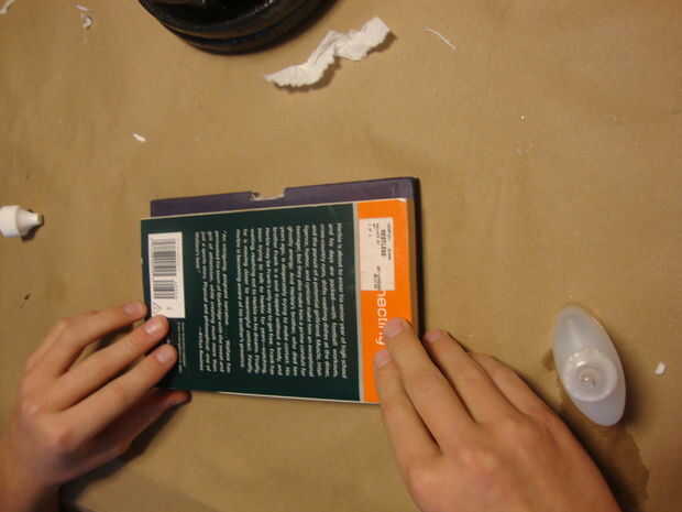 ahora están pegando los libros! Esto es probablemente la parte más difícil de este proyecto. Digo es la más dura porque hay que asegurarse de que los libros están en línea, y que no pegue a cerca de la orilla. Si el pegamento a cerca del borde de la espuma se sale de los lados. Y si eso sucede se ve mal. Así que tenga cuidado y pegamento sobre