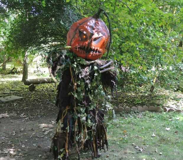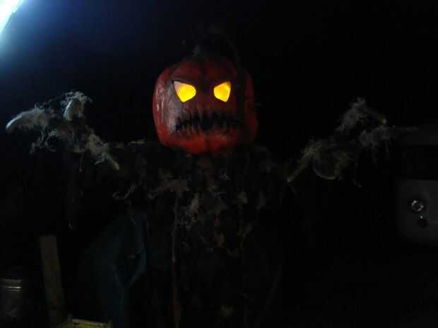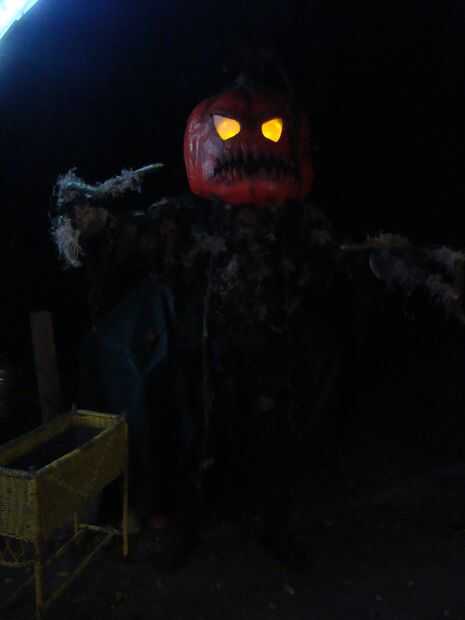 Este es el verdadero rey de la calabaza, no ese impostor esqueleto, Jack Skellington. Su cabeza fue hecha originalmente de papel maché, cubierto con cinta de papel de aluminio, pero no sobrevivió a almacenamiento de información. El nuevo jefe se hace de tablero de la espuma de aislamiento de 2 pulgadas. Su cuerpo es de tela, y las hojas y tallos son de plástico, tela y arpillera. Sus dedos son piscina tallarines espuma. Sus ojos parpadean como si hubiera una llama dentro de la cabeza.