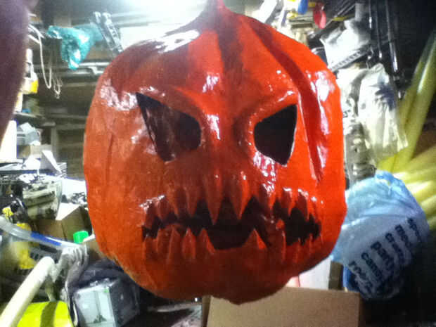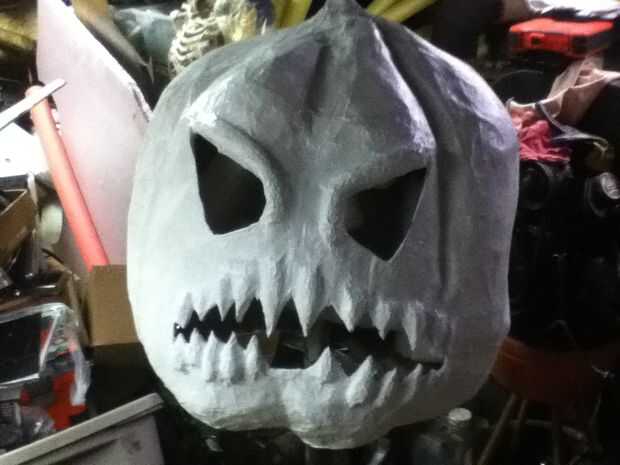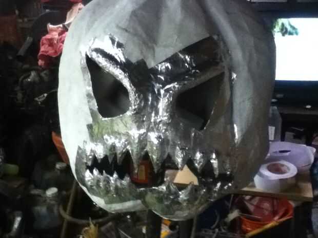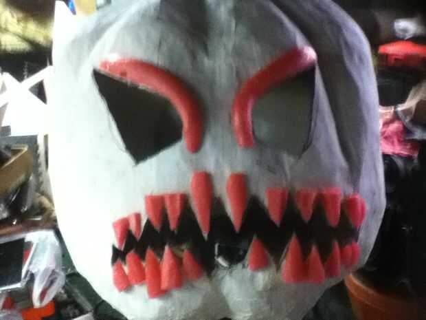 Corte los orificios de ojos y boca con una herramienta Dremel. Para hacer los dientes y crestas de ojo, me cortar las piezas de espuma de una piscina de fideos y aerosol-pegado en la cabeza. Cubrí la espuma con cinta de papel de aluminio, gessoed, luego pintó toda la cabeza con Rustoleum efectos satén fuego naranja.