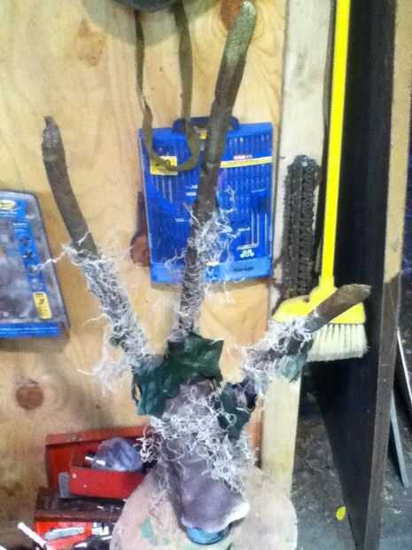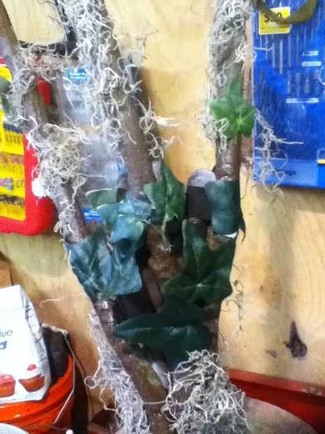 Las manos son un par de guantes de soldadura de puerto de carga. Había grabado los dedos con cinta de Hockey, así que hay tres dedos. Hice dedos largos "vid" de cortes de los tallarines de la piscina reforzada con un trozo de alambre empujó dentro. Se pintaron las manos, y luego habían agregado hojas y musgo español.