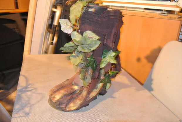 Las botas se hicieron del mismo modo que las manos-tomé un viejo par de "Wellington" botas de goma, pegadas tiras de los tallarines de la piscina para hacer "Raíces" luego pintaban vides y hojas marrones y agregados.
