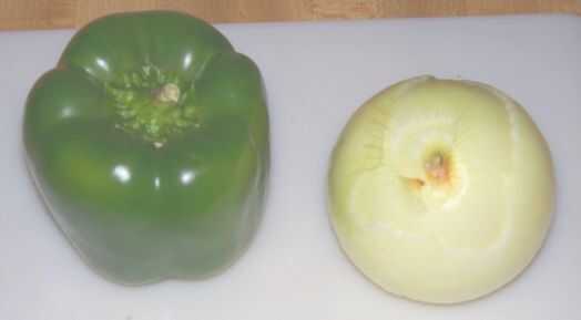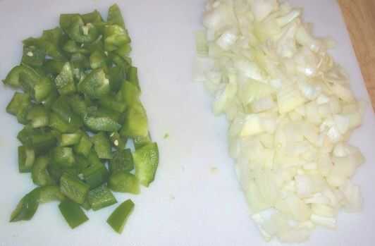 a continuación se dice el pimiento y la cebolla. Usted puede hacer esto mediante el uso de un cuchillo o si tienes algún tipo de procesador de alimentos, como un mimado Chef picadora, que funcionaría bien. Asegúrese de tener la piel seca de la cebolla antes de picarlo. Si usted elige utilizar un cuchillo de la mejor manera de cortar la cebolla es cortar en semicorcheras corte desde arriba hacia abajo y luego cortar las tiras en trocitos. Cortar el pimiento es similar a la cebolla. Se barrio la pimienta y limpiar las semillas fuera de él. A continuación, será cortar los cuartos en tiras y y cortar las tiras en trocitos.  Las piezas deben ser pequeños, si no más pequeño, como las piezas que se muestra a continuación en la segunda foto.