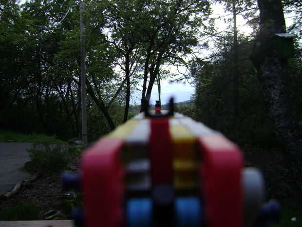 bien, Hola. Este es mi nuevo rifle de asalto. He hecho esto en unas 3 horas. Resultó mucho mejor de lo que esperaba. Dispara unos 40 pies pero tiene un muy buen disparador fuerte así que tal vez 50 pies. El bloque de disparo en el cañón funciona como