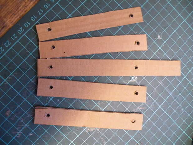 Había agrupado las tiras juntas, luego utilizar mi taladro para poner los agujeros en cada extremo. Sí, perforé tarjeta acanalada suelta - es más fácil que meter cosas afiladas a través de un tiempo menos y significó que los agujeros fueron todos colocados idénticamente.