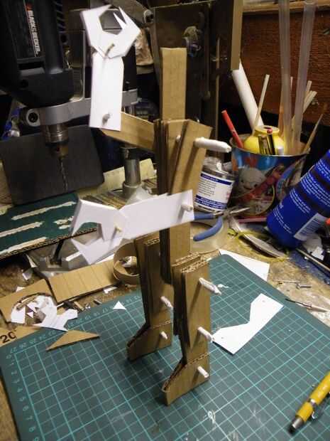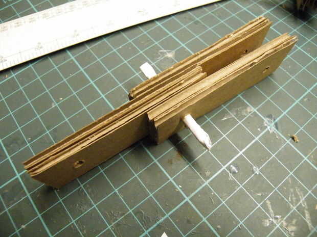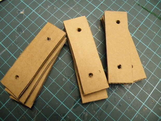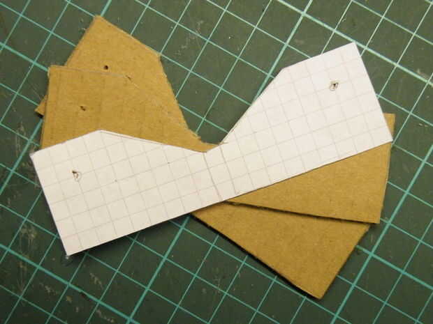 Los pies se hicieron cada uno de una sola pieza de tarjeta acanalada, doblada por la mitad en el dedo del pie (véase la plantilla) y en el tobillo con un rollo de papel.