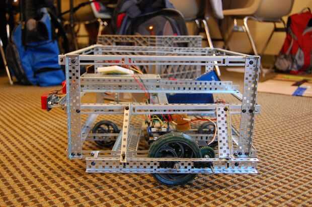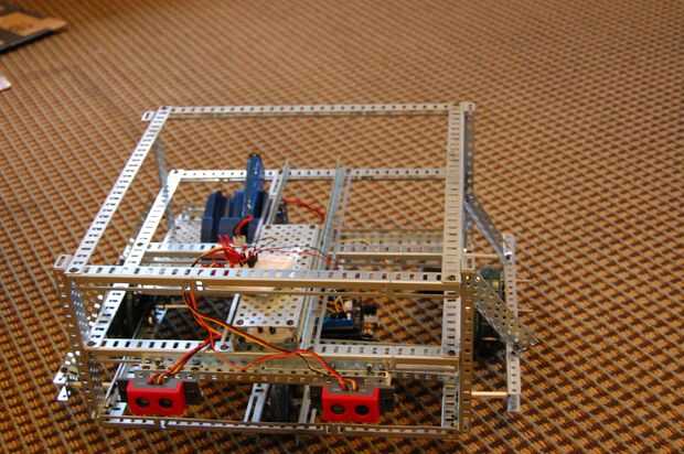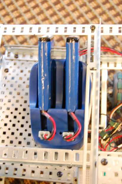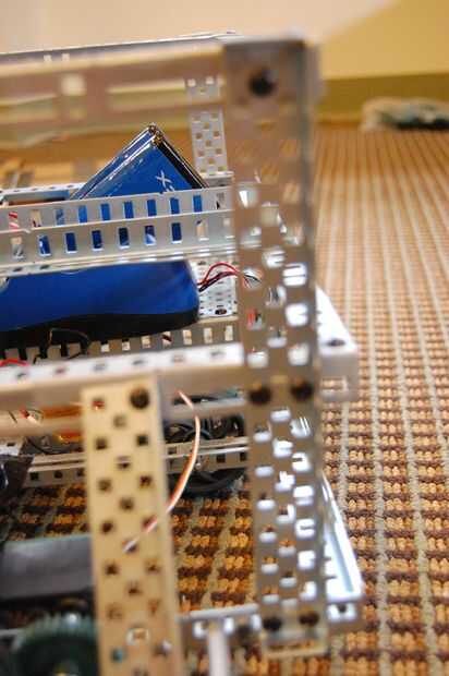 13. Fije el ángulo ranurado de 7 1/2" a 3 set de dobles orificios en el riel en la parte posterior derecha del robot. El ángulo ranurado debe ser paralelo al lado derecho del robot. Adjuntar 3" canal c pieza para que TI se alinee con la ranura 12 en la parte posterior ranurado pieza acodada en el primer fotograma. Debe fijarse verticalmente y a las ranuras de tiempo. Coloque otro ángulo ranurado de 7 1/2" en el canal de c en el 3 º juego de agujeros doble. Sólo un tornillo puede ser utilizado en este. Después de esto, instale dos placas de metal a ambos ángulos ranurados y fijar un ángulo ranurado de 5" en la parte superior las placas metálicas, una hacia delante y hacia atrás. Esta casa la 9.6v baterías.