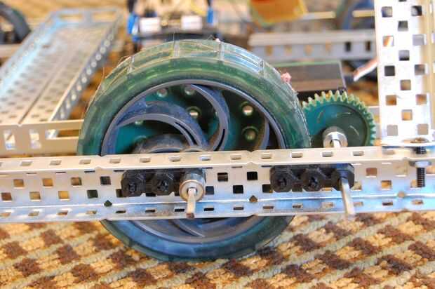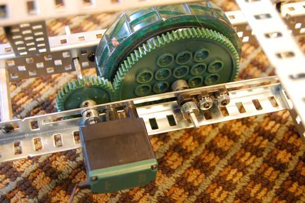 10. montar un motor VEX para que sea el eje hacia la parte posterior del robot. El eje debe alinearse con la ranura 9 de ángulo ranurado de la parte posterior. En esta secuencia en el eje: motor, collar del eje, ángulo ranurado, collar eje, engranaje de 36 dientes, eje collar, collar de eje.