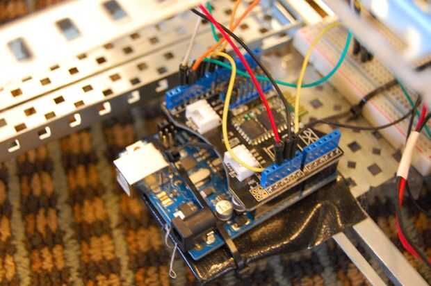 7. Fije una placa de metal a los dos ángulos anteriores, así como los dos ángulos ranurados en el primer fotograma hacia el centro. Estas placas llevará el Arduino y breadboads. Asegúrese de colocar una tira de cinta de conducto o gorila en la placa que llevará el Arduino.
