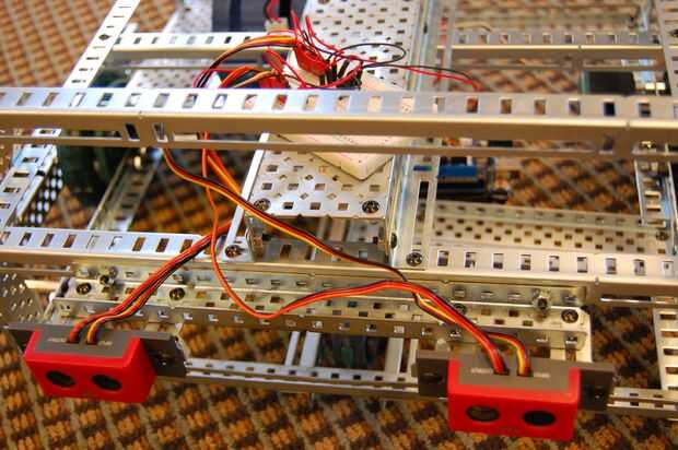 14. fijar un canal 10" c-al frente del segundo cuadro, desde el interior de las ranuras de tiempo y saliendo hacia el frente. Centrarlo lo más posible. Luego, coloque los cuatro refuerzos de metal en los sensores ultrasónicos y luego sujete al lejos izquierdo y extremo derecho contra derecho del canal en c.