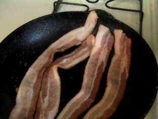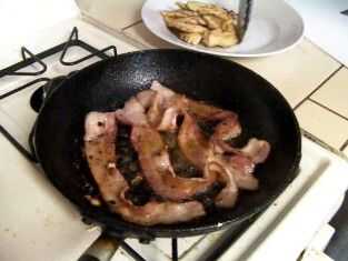 Bien el primero tienes que hacer es tarta buttering su cacerola, se cocina el tocino y el pollo o cualquier otra cosa que tenga en la mano. Hemos hecho con diferentes tipos de alimentos y los ingredientes, como pollo, carne de res, jamón, salchicha, perros... etc.