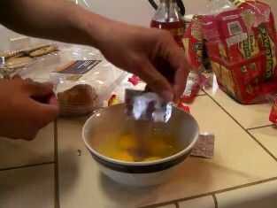 En un recipiente pequeño necesita sumar los huevos y el paquete de condimentación. Esto funciona como un agente de la vinculación adicional para tu sandwich. Necesita aproximadamente 1 huevo por sandwich para que funcione.